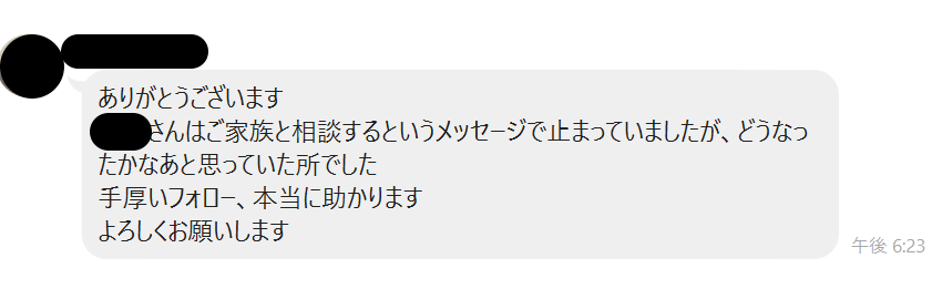 ありがとうございます。**さんはご家族と相談するというメッセージで止まっていましたが、どうなったかなあと思っていた所でした